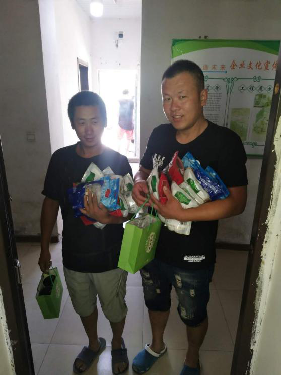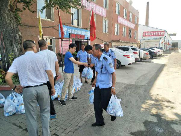 8月1日建材廠執行總經理王軍輝、副總經理回德福為員工們發放解暑物資。
